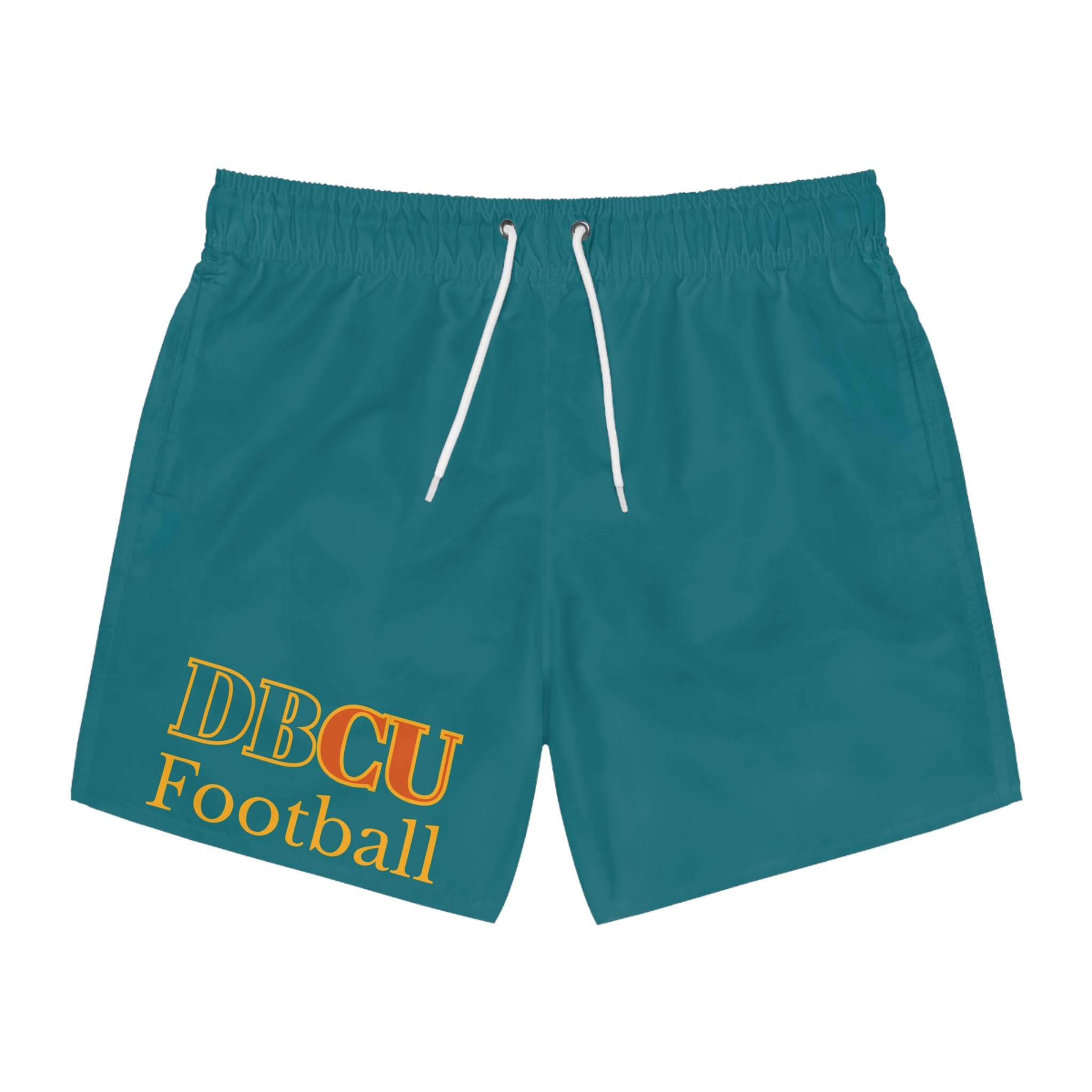 These swim trunks are built for long days of sun, surf, and sidelines. Lightweight, quick-dry polyester moves with you and dries fast after a dip, while a comfortable elastic waistband and white drawstring let you dial in the fit. Mesh-lined side pockets and a mesh basket lining keep you comfortable and secure. The teal base with bold team-style lettering gives a sporty, vintage-college feel—wear them to the beach, to water drills, or while cheering from the stands.