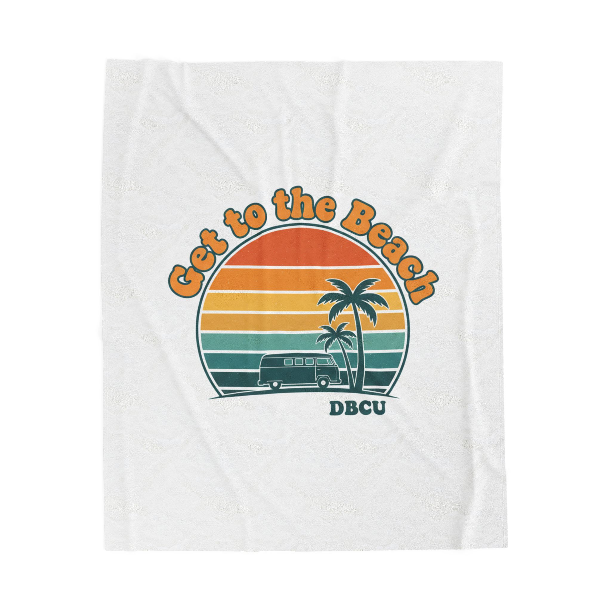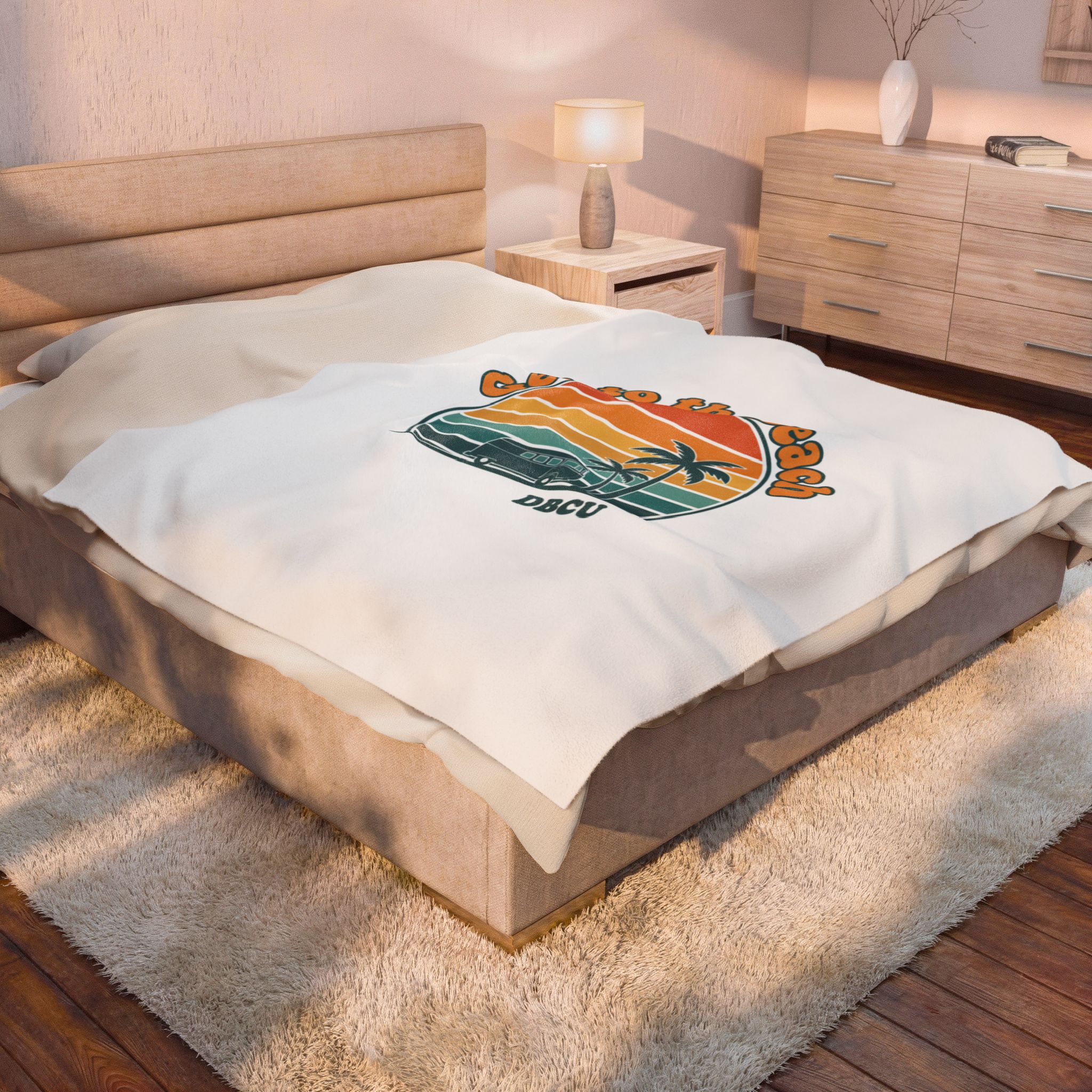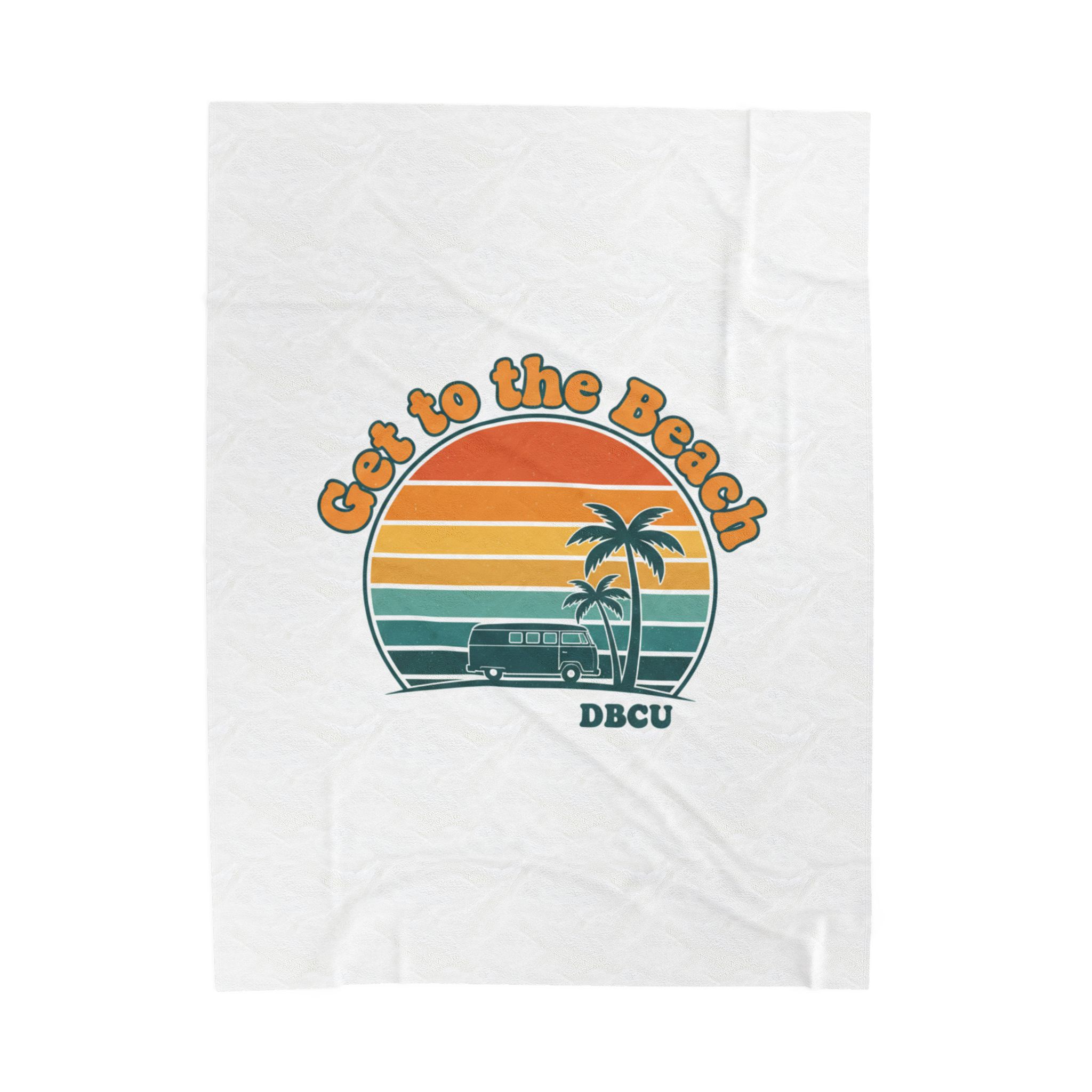 Soft, sun-bleached beach vibes captured in a vintage postcard-style sunset graphic. A rounded, retro sunset banded in warm oranges, mustard and teal sits above palm silhouettes and a small surf scene, evoking road-trip and golden-hour nostalgia. Tailored to the Analog Sunshine 1970s Aesthetic, this plush blanket layers easy summer styling into everyday lounging or travel for retro and travel-loving audiences.