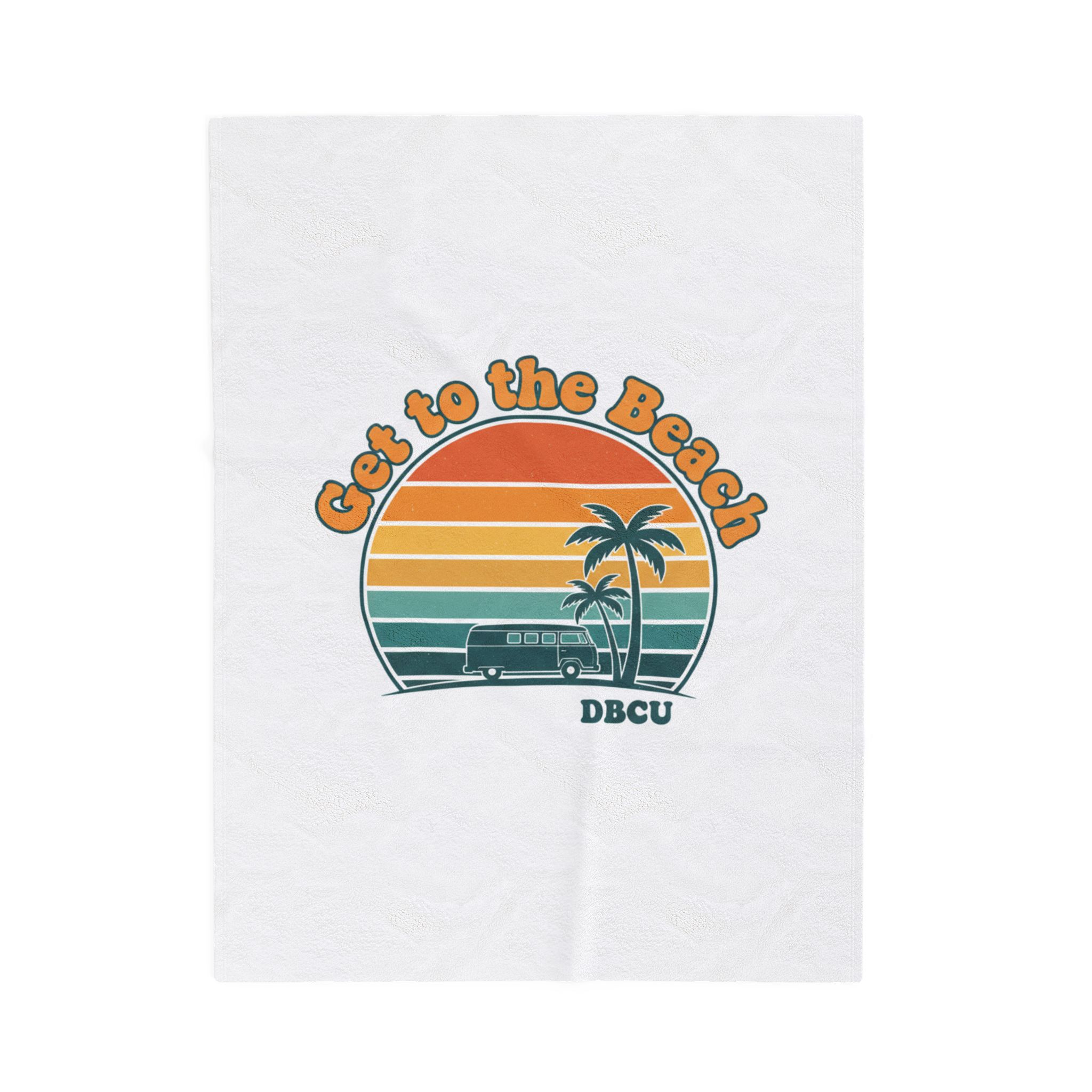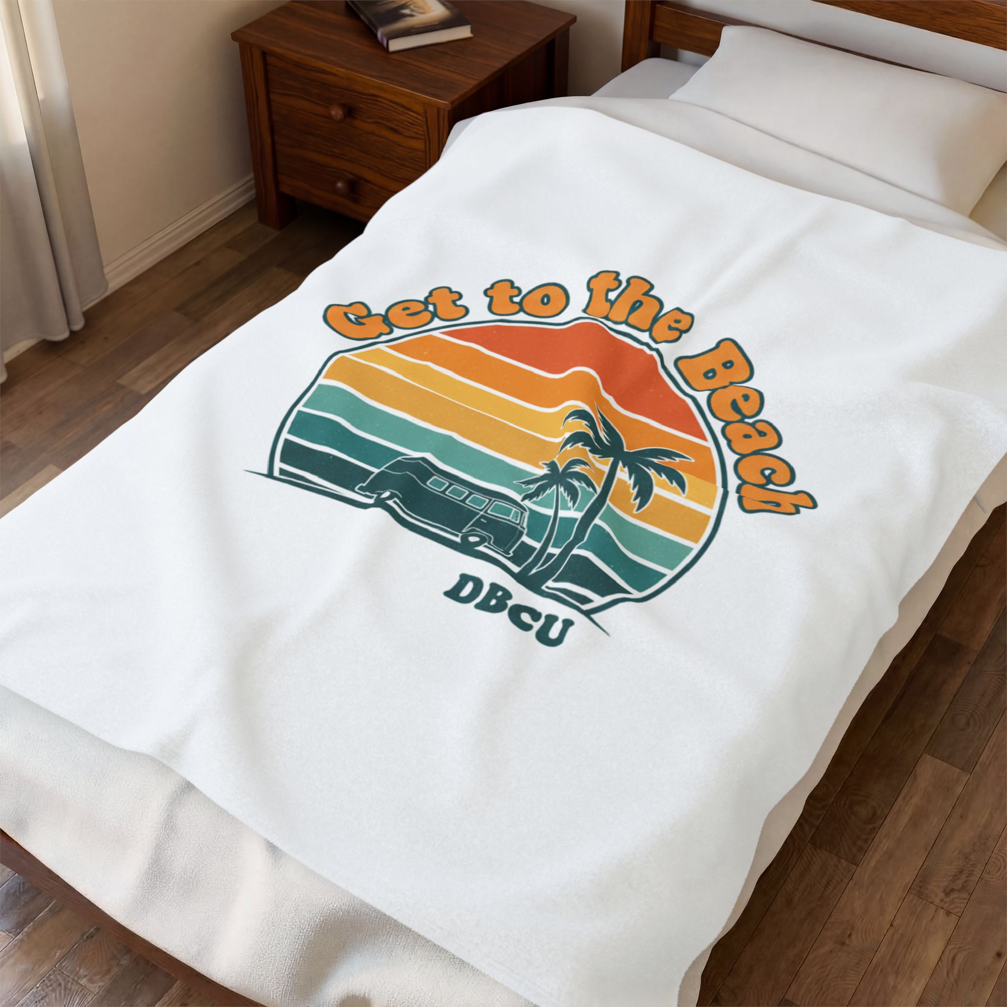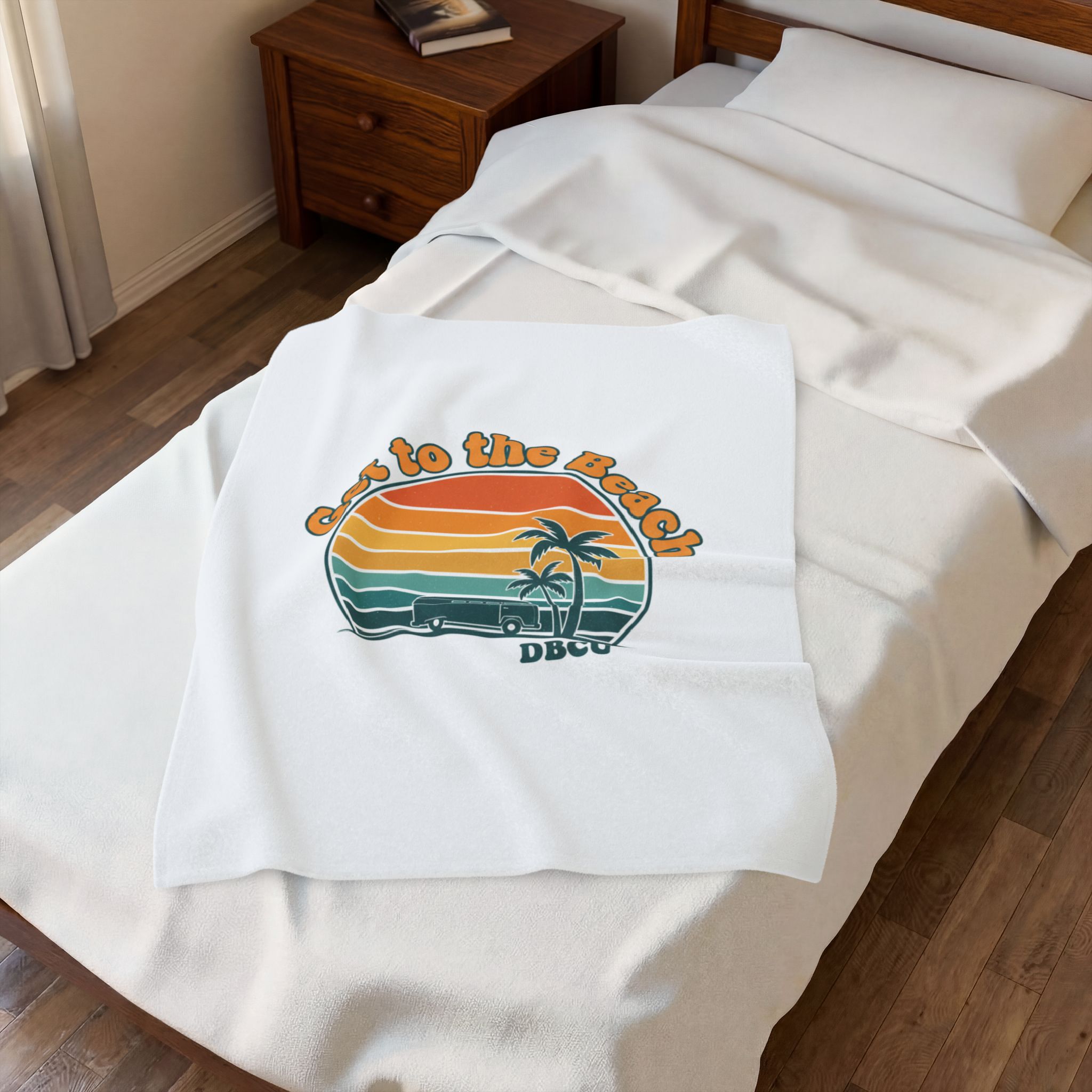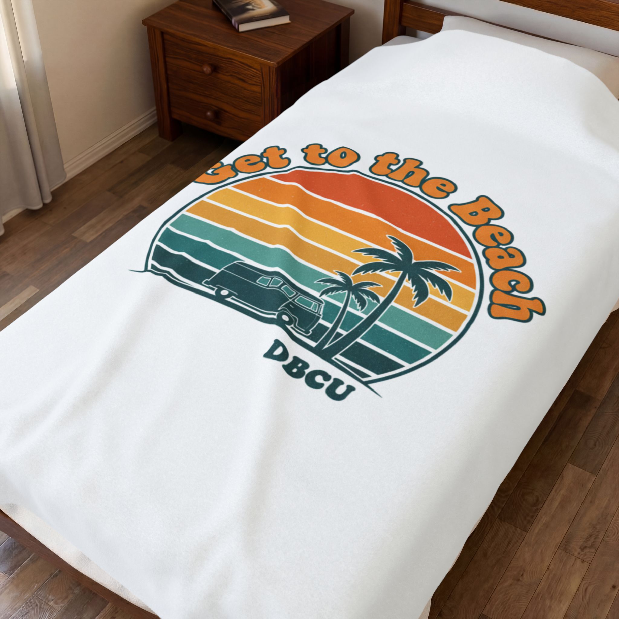 Soft, sun-bleached beach vibes captured in a vintage postcard-style sunset graphic. A rounded, retro sunset banded in warm oranges, mustard and teal sits above palm silhouettes and a small surf scene, evoking road-trip and golden-hour nostalgia. Tailored to the Analog Sunshine 1970s Aesthetic, this plush blanket layers easy summer styling into everyday lounging or travel for retro and travel-loving audiences.