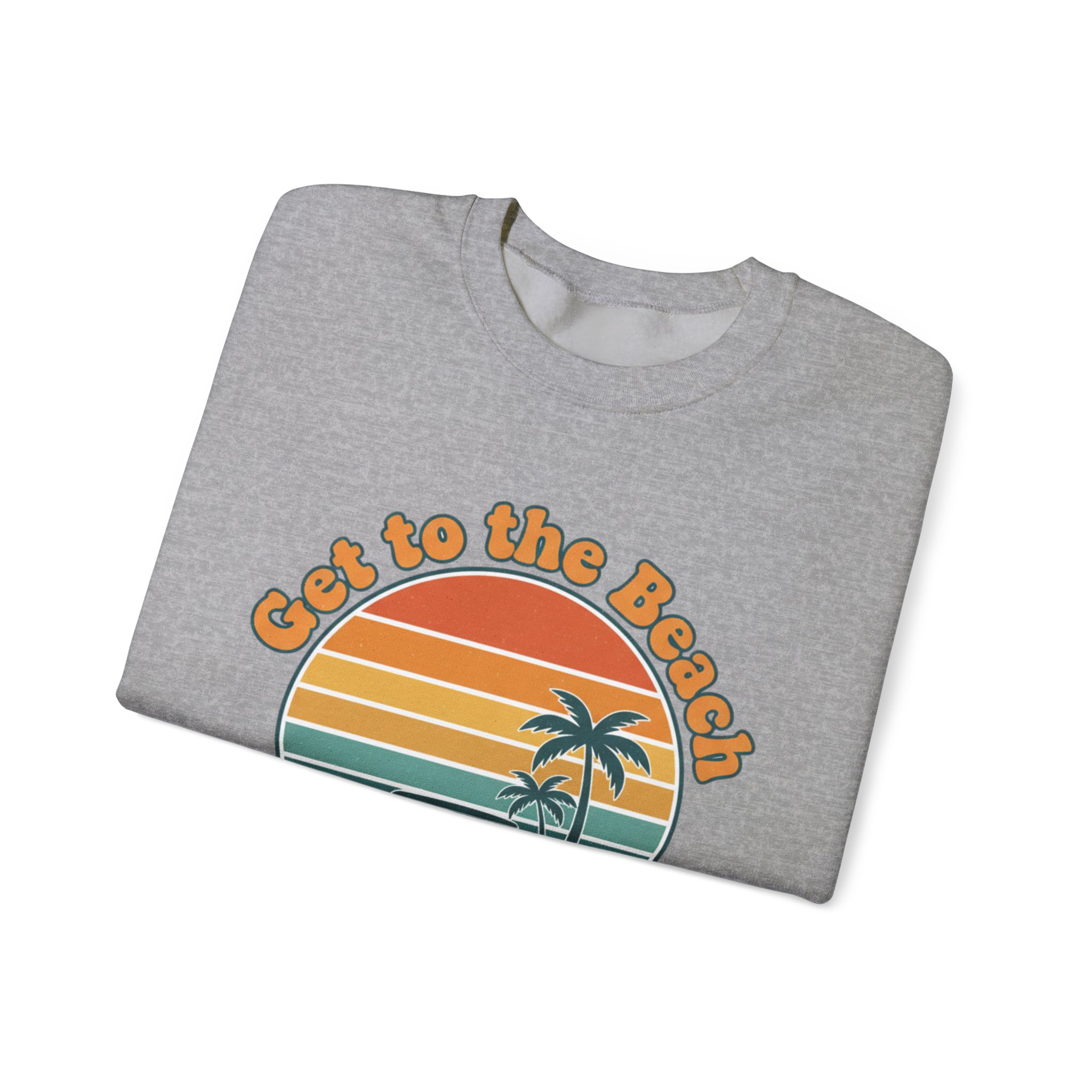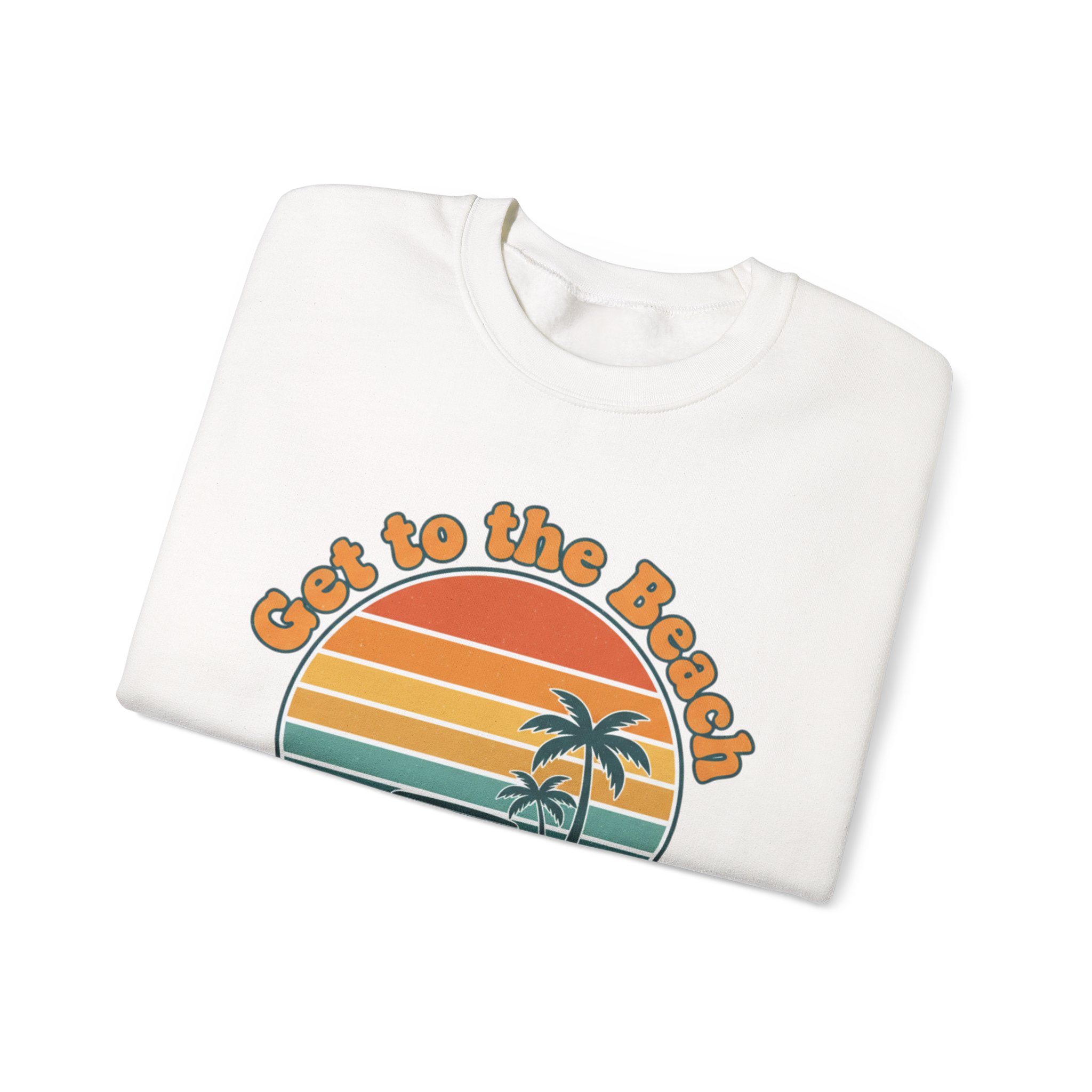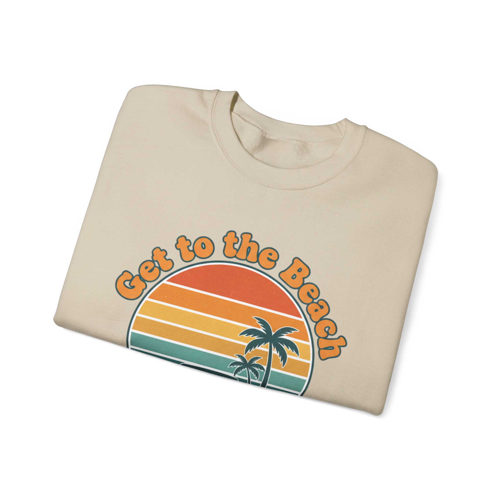 A soft, sun-bleached crewneck printed with a grainy 1970s postcard-style sunset and twin palm silhouettes. The rounded, retro type and warm gradient stripes (mustard, burnt orange, teal) give a relaxed, vacation-core vibe that reads like a golden-hour memory—wearable nostalgia for casual summer layering or cool evenings after long drives. Fits into the Analog Sunshine 1970s Aesthetic through its vintage surf/postcard motif and rounded typographic mood, making it a subtle nod to retro palm and sunset graphics without referencing specific places or brands.