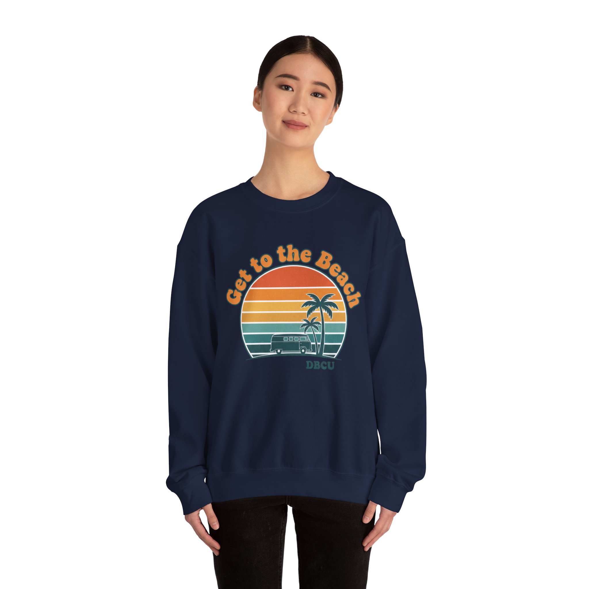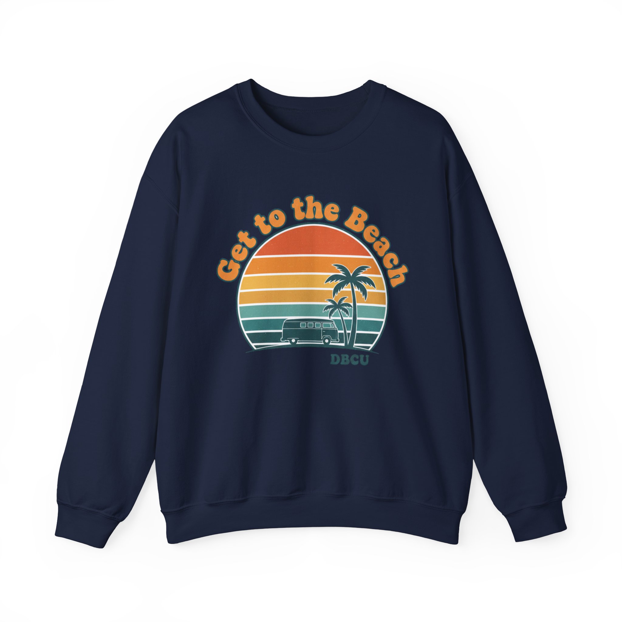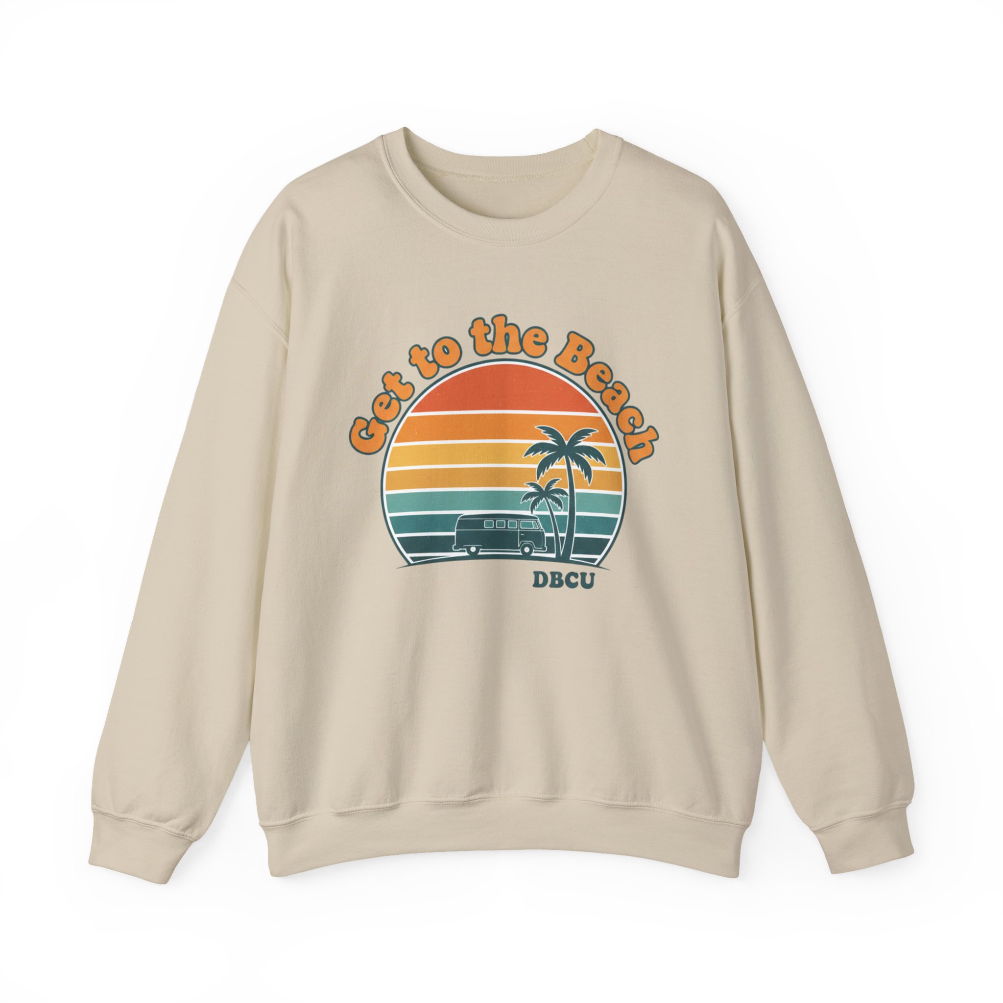 A soft, sun-bleached crewneck printed with a grainy 1970s postcard-style sunset and twin palm silhouettes. The rounded, retro type and warm gradient stripes (mustard, burnt orange, teal) give a relaxed, vacation-core vibe that reads like a golden-hour memory—wearable nostalgia for casual summer layering or cool evenings after long drives. Fits into the Analog Sunshine 1970s Aesthetic through its vintage surf/postcard motif and rounded typographic mood, making it a subtle nod to retro palm and sunset graphics without referencing specific places or brands.